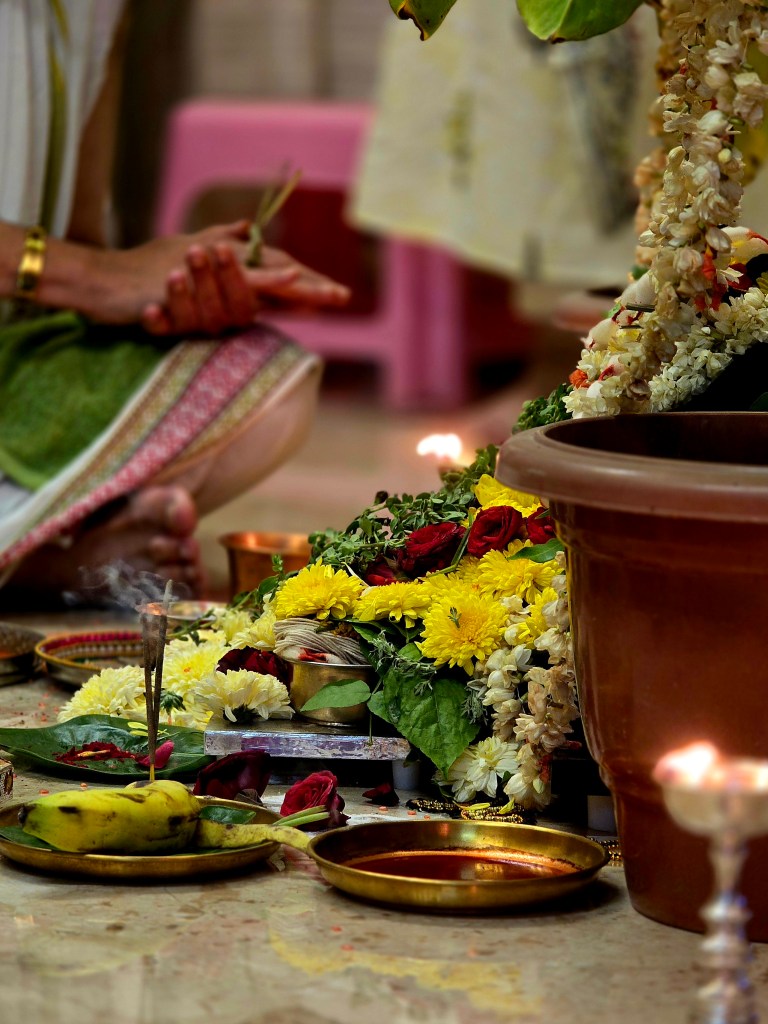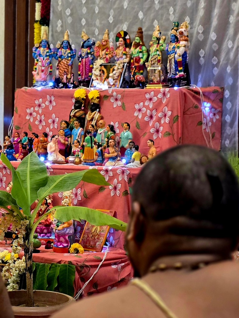 The evening wasn’t just about dolls. The evening was also Sam’s families annual ritual of performing a SatyaNarayan Katha, two purohits sat cross-legged on mats, textbook Brahmin priests — shaven heads, long tufted bodis, crisp white dhotis, and an air of calm concentration.