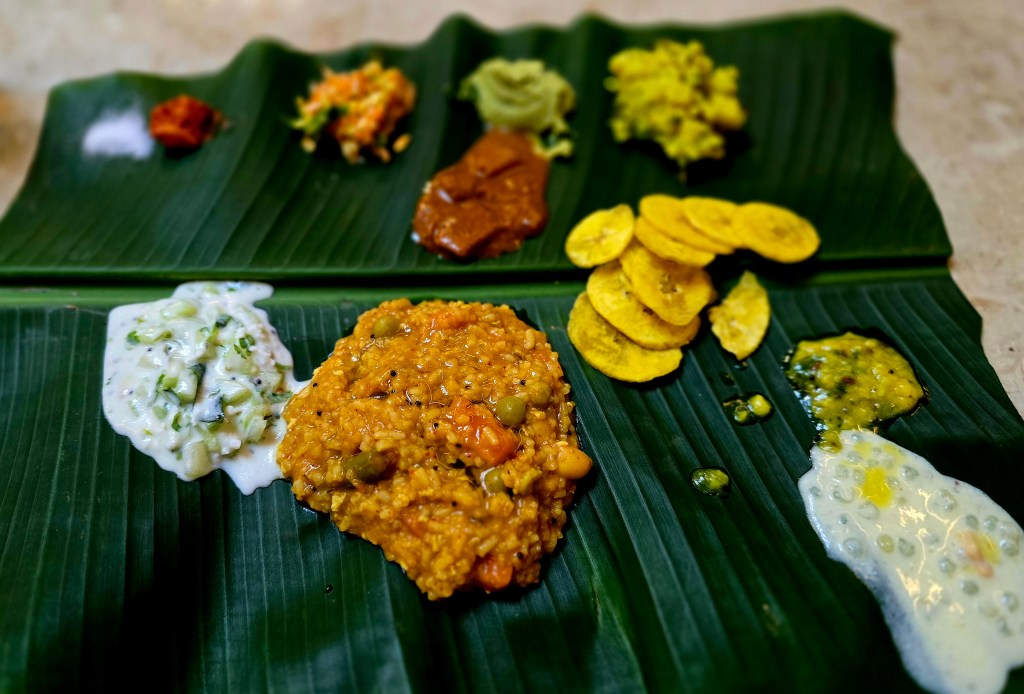 We sat cross-legged on the floor, banana leaves unfurled before us — a sight that still makes my heart flutter with anticipation. The meal began, as all good South Indian meals do, with a riot of sides: a tangy lemon pickle that tingled awake every taste bud, kosambari (a chilled salad of soaked moong dal, cucumber, and coconut), cucumber raita, and a small mound of coconut-mint chutney.