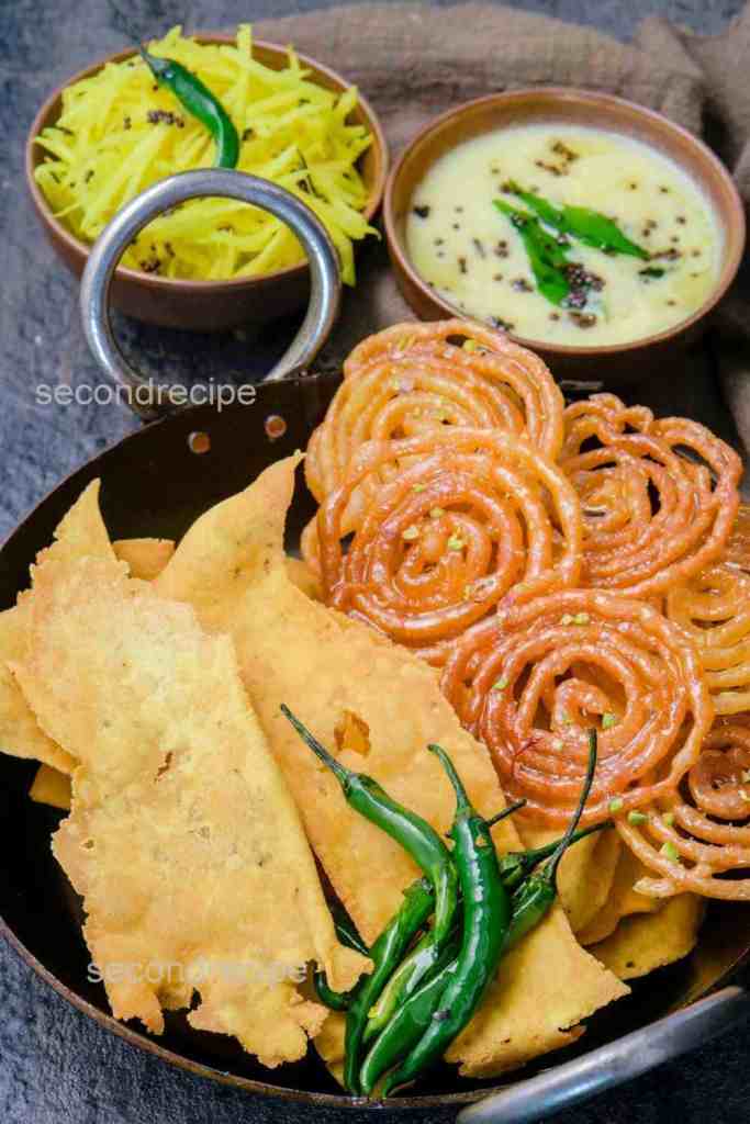 Crisp gram-flour fafda, syrup-soaked jalebi, raw papaya sambharo, fried green chillies—sweet, salty, spicy, oily, crunchy. January mornings are cold. Kite flying burns energy. This breakfast delivers warmth and stamina in one decisive plate.